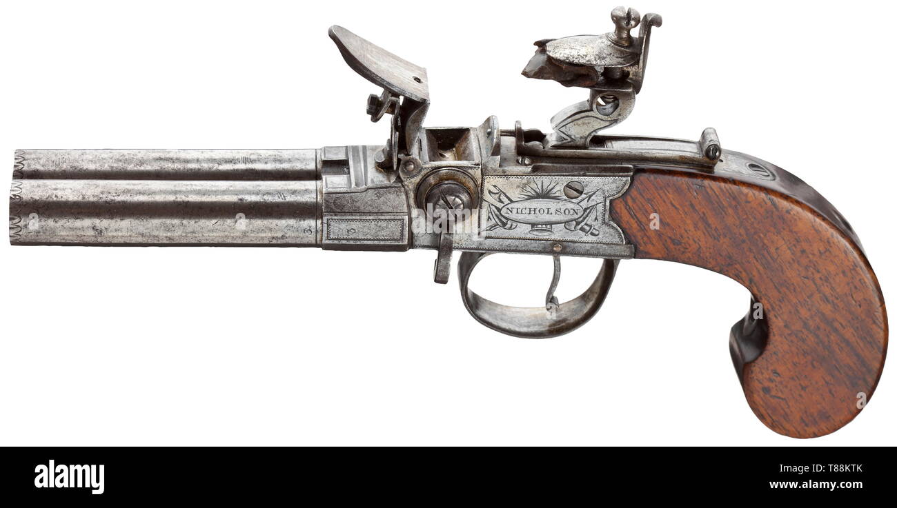 A Pair Of Double Barrelled Flintlock Pistols William Nicholson London Circa 1790 Parallel Unscrewable Smooth Bore Barrels Slightly Engraved At The Muzzles With False Rifling In 11 Mm Calibre Numbered 1 4 Each